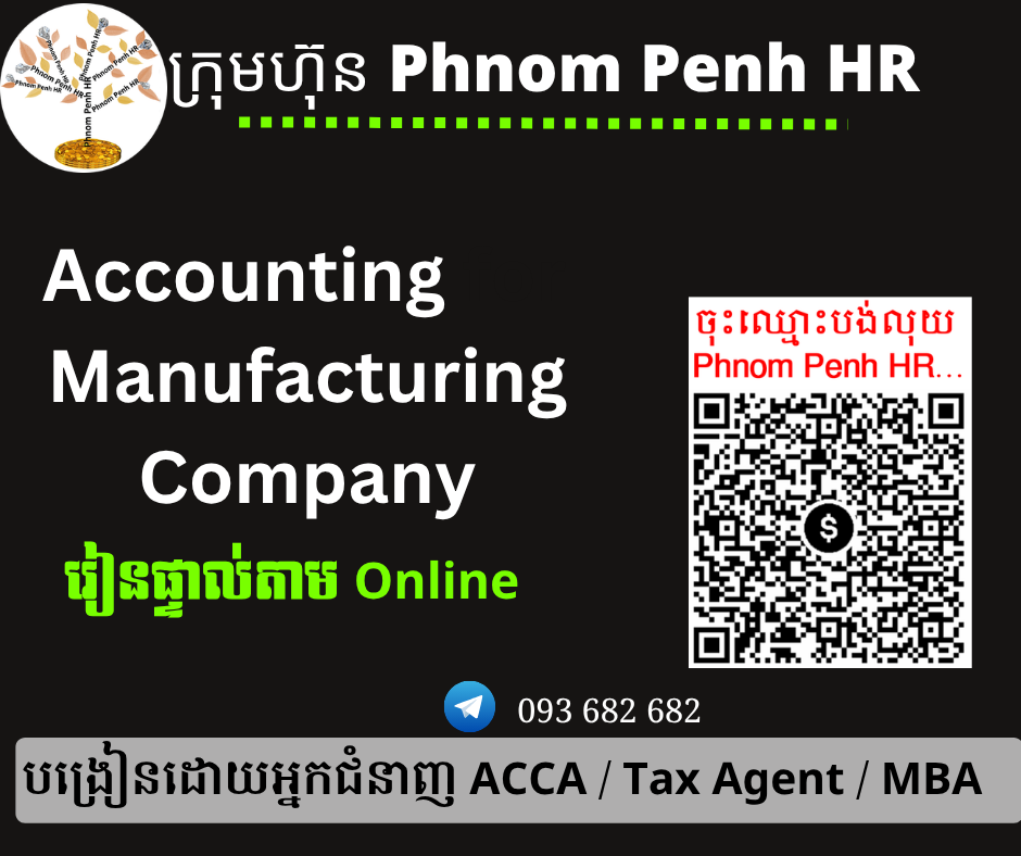 រៀនផ្ទាល់តាម Online ៖ Accounting for Manufacturing Company (គណនេយ្យសម្រាប់ក្រុមហ៊ុនផលិតកម្ម) 👉 រៀនតែ ១ ថ្ងៃ វគ្គថ្មីចូលរៀនថ្ងៃសៅរ៍ទី 18/4/2026 ពីម៉ោង 8 AM to 12 PM និង 1:30 PM to 5:30 PM